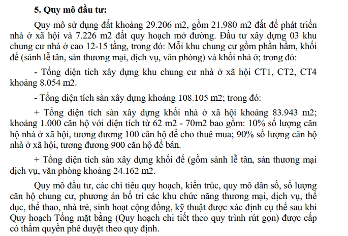Quy mô đầu tư của dự án Vibex sử dụng hơn 29.000 mét vuông, trong đó 21.980 mét vuông đất sử dụng để phát triển nhà ở xã hội và 7226 mét vuông đất quy hoạch mở đường. Đầu tư xây dụng 03 khu chung cư nhà ở cao 12 – 15 tầng. Mỗi khu chung cư gồm tầng hầm, khối đế (sảnh lễ tân, sàn thương mại, dịch vụ, văn phòng và khối nhà ở).